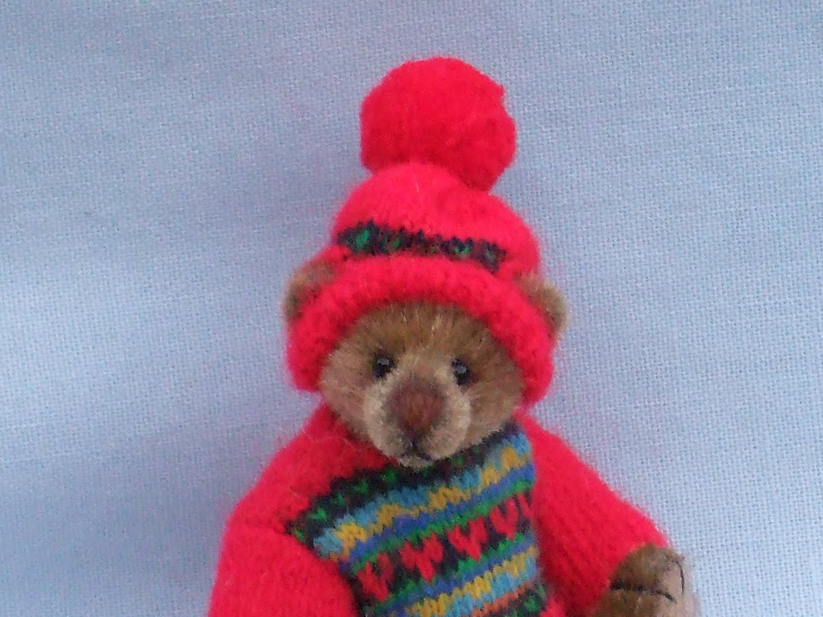 Claude is a 2.5 inch bear in purple long pile velvet suit with hood . He has onyx eyes and an embroidered nose .