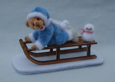 Crispin is a 2 inch bear made in vintage velvet with onyx eyes and an embroidered nose .He has an open mouth and wears a fur trimmed snow suit with hood and scarf and silver grey boots .He is riding on his sledge with a little snowman toy .