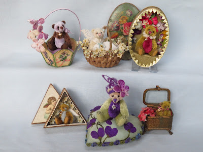 Violet Creme is a 2"(5.5cm) bear made from long pile vintage velvet in lilac and chocolate brown .She has onyx eyes and an embroidered nose .She wears a silk bow with a tiny gold coloured puffed heart charm.She sits on a silk pad inside an antique card basket which has been made from antique cards with very pretty pictures of violets on them , all different .I have added the vintage violets and handle .